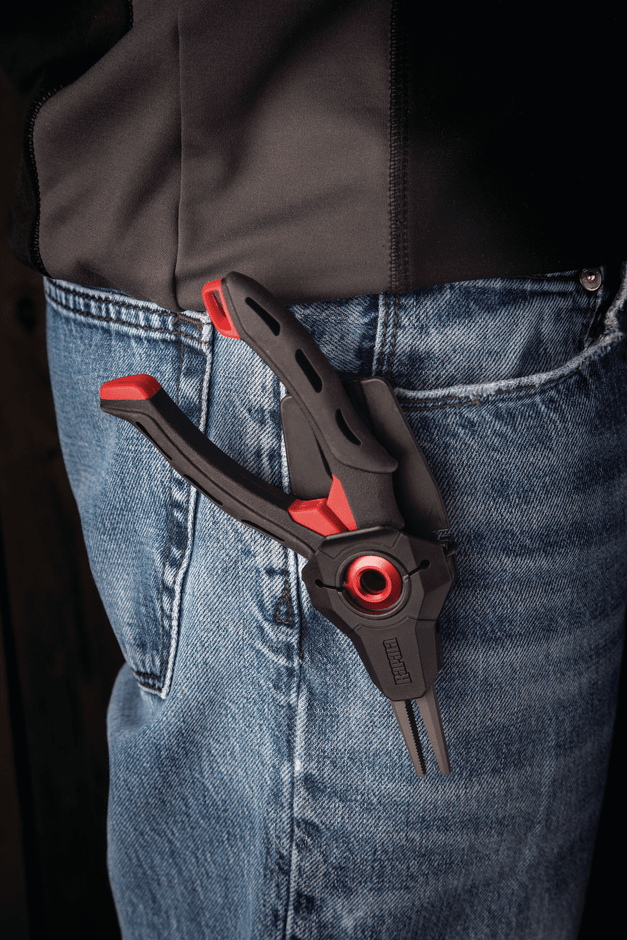 Rapala’s proprietary, patent pending Mag Spring mechanism on the pivot point of the pliers has two opposing magnets that push away from each other and hold the pliers open for easy one hand operation. Unlike springs, the magnets won’t break or lose their power in use. The durable stainless steel jaws with gun metal finish have serrated tips for secure grip. Ergonomic, co-molded Soft Grip handles for comfortable hold.