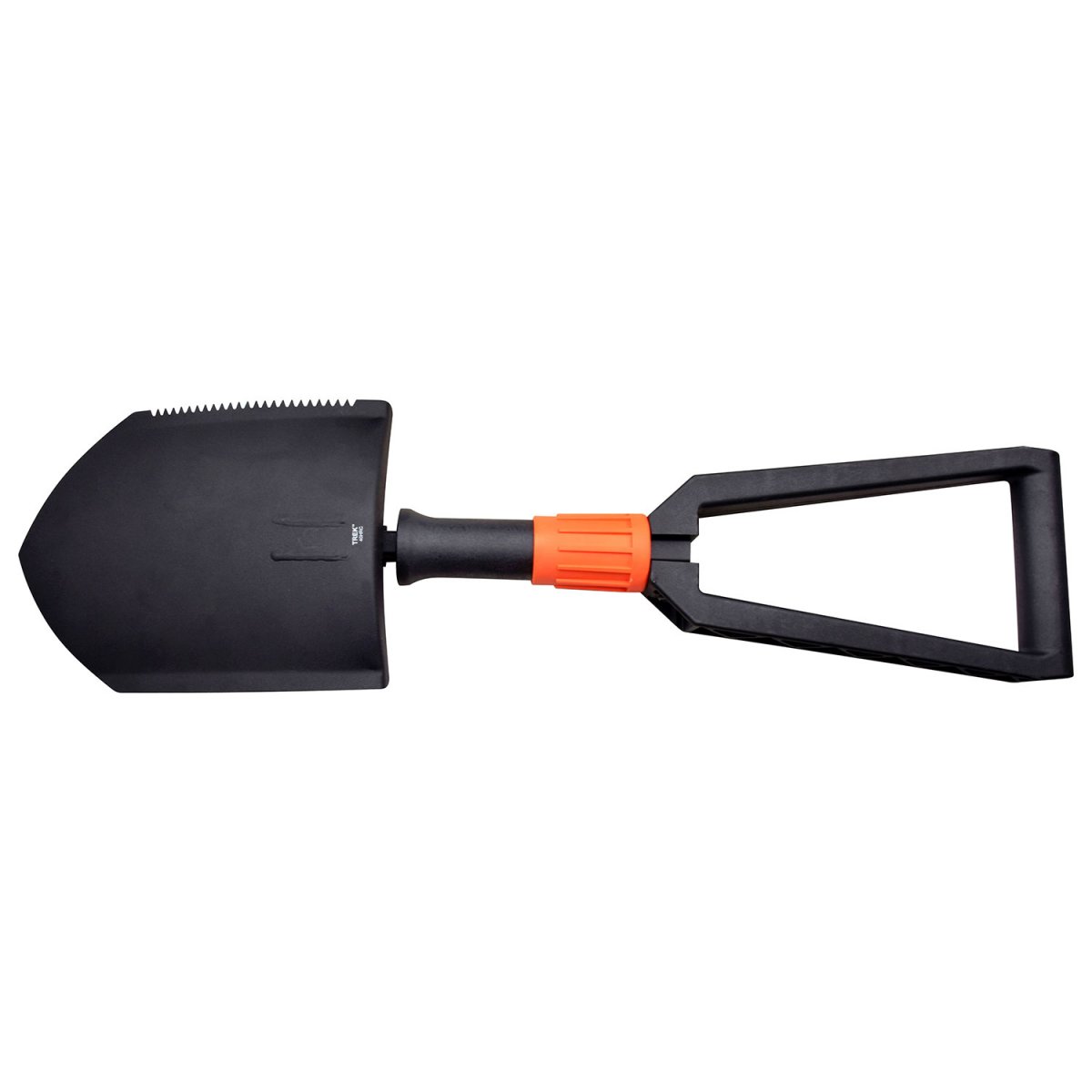 SPECIAL FEATURES: Foldable Shovel/Entrenching Tool - Black Carbon Steel Blade with One Serrated Edge, Steel Tube with Injection Molded Nylon Fiber Handle. Measures 23-inches Overall.
